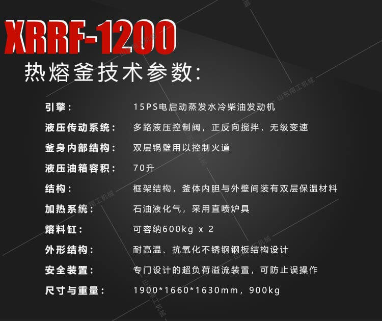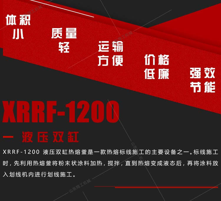 XG1200液壓雙缸熱熔釜是一款熱熔標線施工的主要設(shè)備之一。標線施工時,先利用熱熔釜將粉末狀涂料加熱,攪拌,直到熱熔變成液態(tài)后,再將涂料放入劃線機內(nèi)進行劃線施工。由于涂料的融化質(zhì)量直接關(guān)系到標線質(zhì)量,因此熱熔釜是熱熔標線設(shè)備的關(guān)鍵部件,是涂料的融化必不可少的部分。