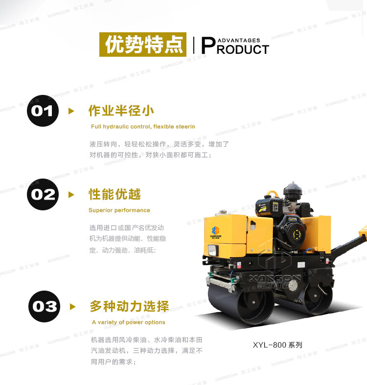 XYL-800C手扶全液壓壓路機(jī)(柴油)主要用于溝渠基礎(chǔ),道路,體育場(chǎng)地的壓實(shí)整平,也可用于壓實(shí)瀝青表面的作業(yè)。