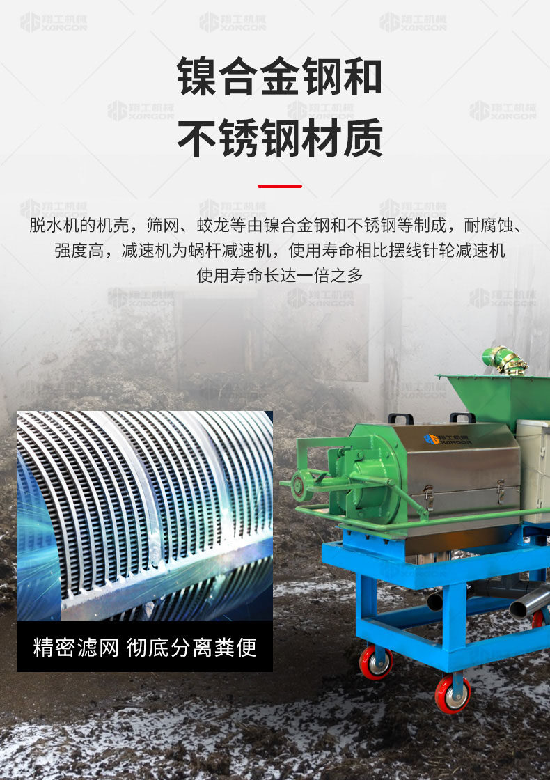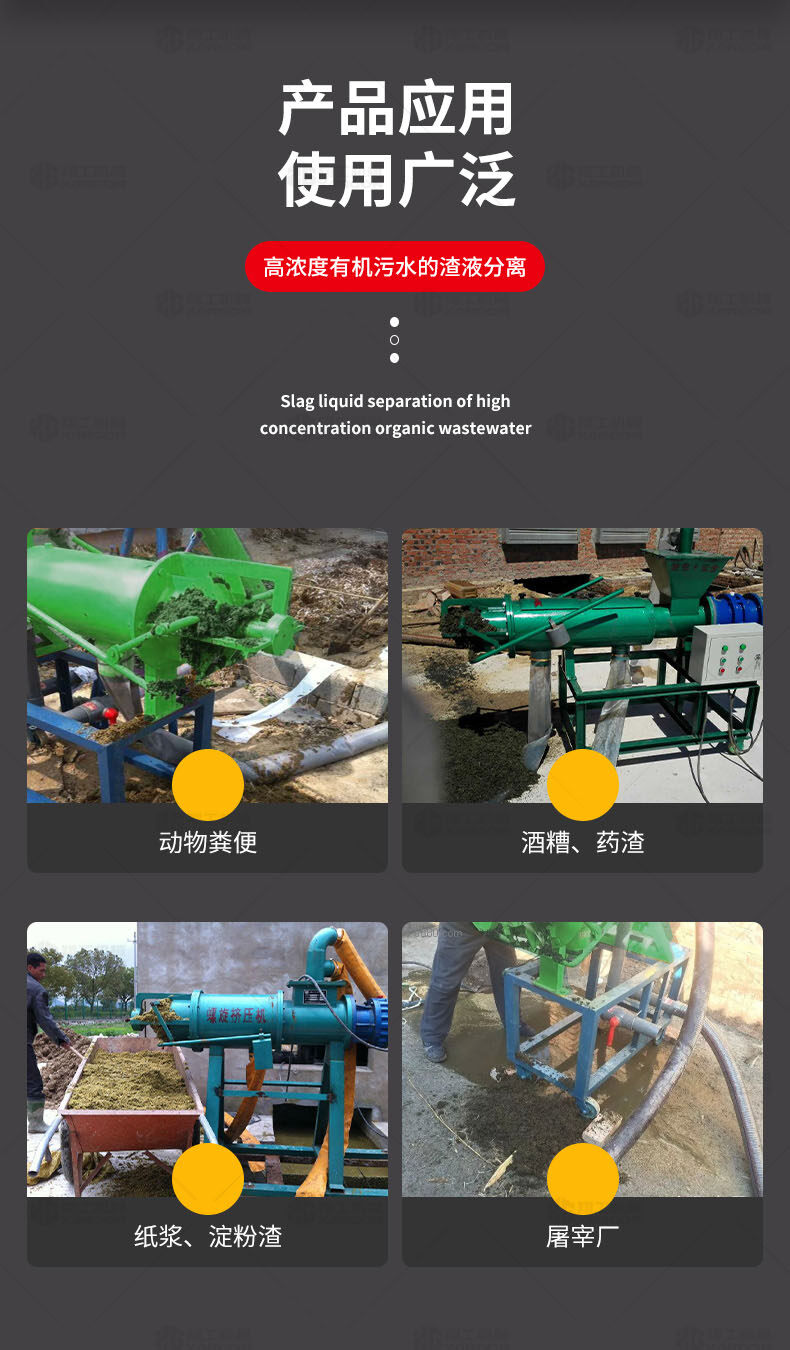 XGF系列固液分離機(jī)可廣泛做為雞、牛,馬及各類集約化養(yǎng)殖場(chǎng)對(duì)紙漿、動(dòng)物糞便、酒糟、藥渣、淀粉渣、醬渣、屠宰廠等高濃度有機(jī)污水的渣液分離。