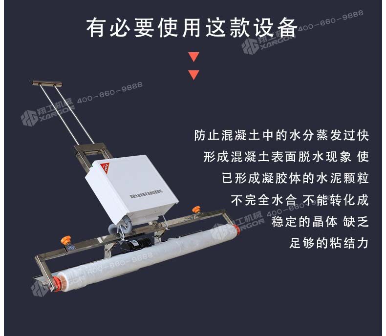 混凝土澆注后,如果養護不及時就容易產生一些不良效果,如氣候炎熱、空氣干燥等情況,我們就有必要使用這款設備,防止混凝土中的水分蒸發過快,形成混凝土表面脫水現象,使已形成凝膠體的水泥顆粒不完全水合,不能轉化成穩定的晶體,缺乏足夠的粘結力。因此,混凝土表面會出現剝落或粉粒脫落。另外,當混凝土強度不夠時,過早蒸發水分會產生較大的收縮變形和干縮裂縫。因此,混凝土澆筑后的初期養護非常重要,終凝后應立即進行養護。