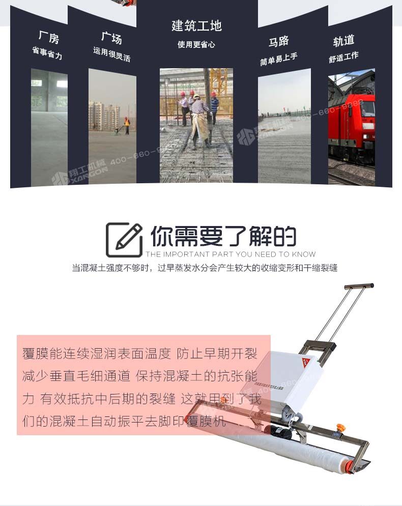 混凝土自動振平去腳印覆膜機主要是用于混凝土澆筑的工作中,此款設備澆筑后會進行覆膜養護,防止水分蒸發過快造成的脫水,混凝土自動振平去腳印覆膜機助力推動覆蓋薄膜養護普及進程,保證混凝土施工效果。