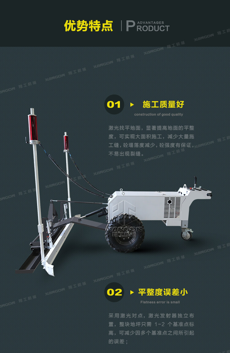 2,本產(chǎn)品的激光控制系統(tǒng)通過反饋調(diào)節(jié),實時監(jiān)控地坪的標(biāo)高,確保地坪的水平平整度和保證地坪的密實均勻;