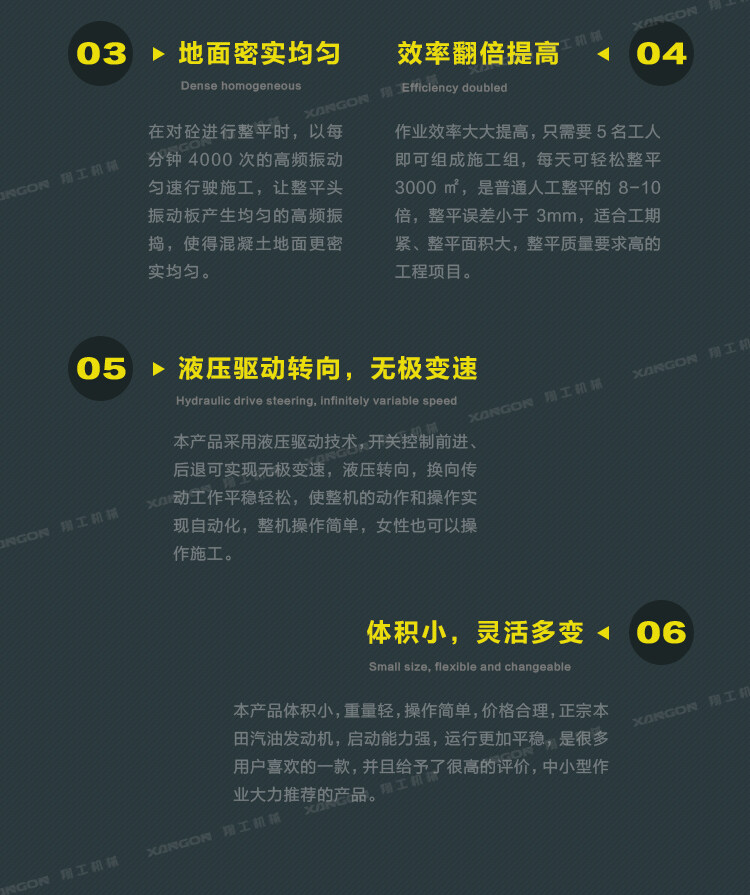 3,本產(chǎn)品能一次性鋪設(shè)混凝土基層,將其抹平將其震蕩光滑,您的工作速度將大大提高,因為該機(jī)器自動設(shè)定標(biāo)高,使得操作員快速的通過工作區(qū)域;