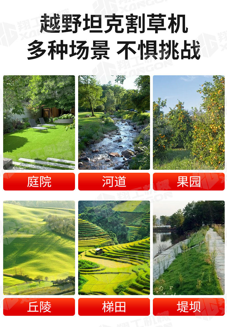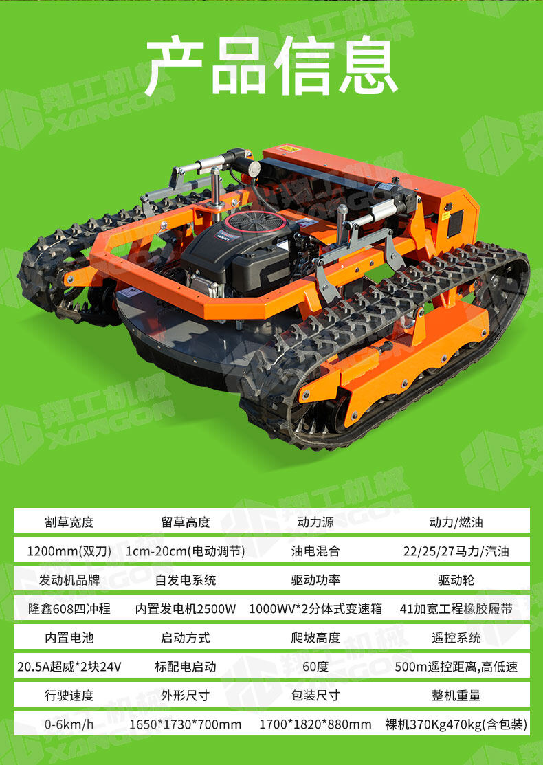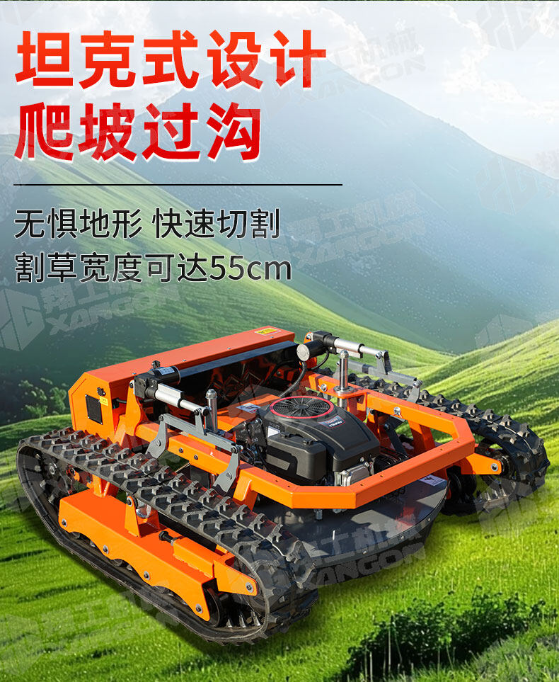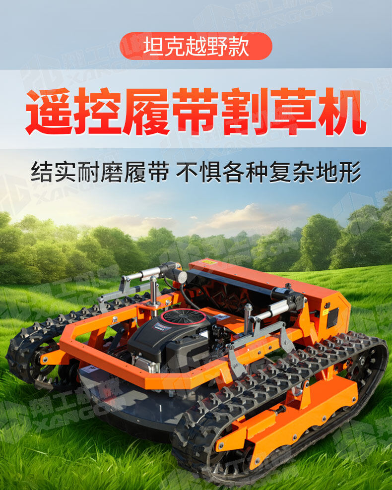 XG-1200是一款革新性的遙控坦克割草機,專為復雜地形設計。其獨特的橡膠履帶底盤,具備卓越的越野與爬坡能力,輕松應對陡坡、濕滑及不平整草坪。無線遙控操作,靈活精準,極大提升了割草效率與安全性,是果園、荒地及專業園藝工作的理想之選。