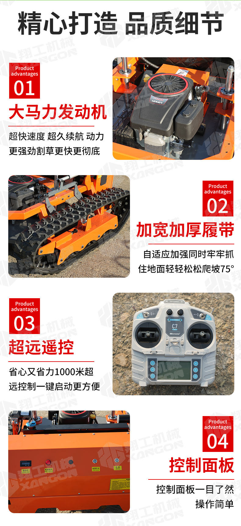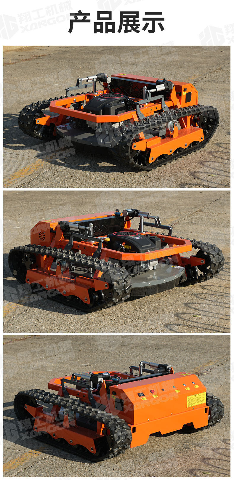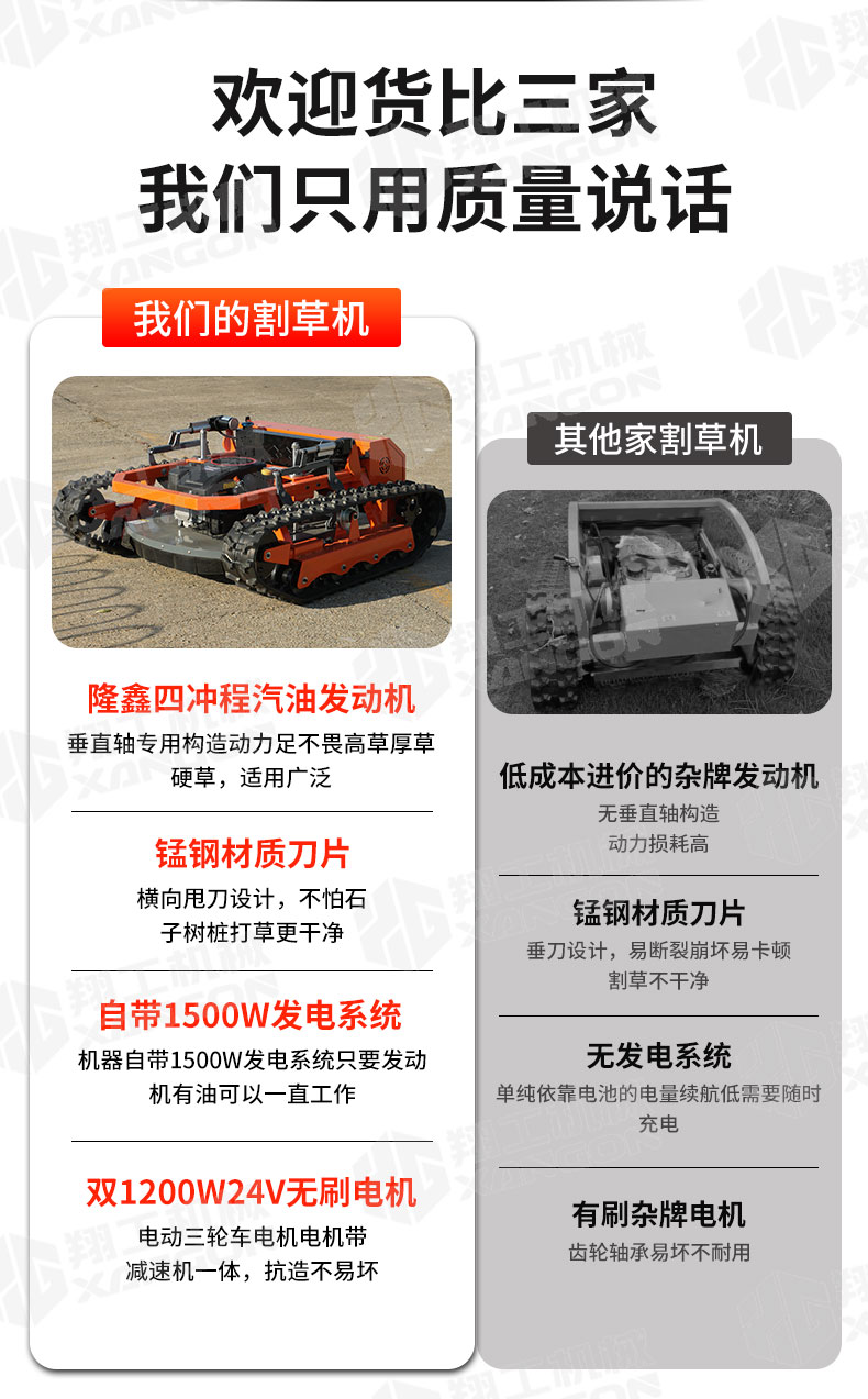 XG-1200是一款革新性的遙控坦克割草機,專為復雜地形設計。其獨特的橡膠履帶底盤,具備卓越的越野與爬坡能力,輕松應對陡坡、濕滑及不平整草坪。無線遙控操作,靈活精準,極大提升了割草效率與安全性,是果園、荒地及專業園藝工作的理想之選。