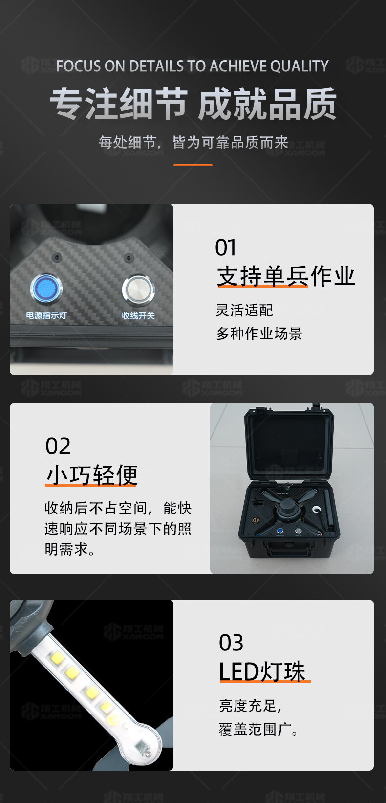 本產(chǎn)品是一款集無人機與強光照明于一體的移動應(yīng)急裝備。采用便攜折疊設(shè)計,可快速部署升空,提供高空廣域照明。具備長續(xù)航、高亮度、抗風(fēng)穩(wěn)像等特點,廣泛適用于夜間救援、工程搶險、警勤巡邏及大型活動保障等場景,是提升夜間作業(yè)效率與安全的理想選擇。